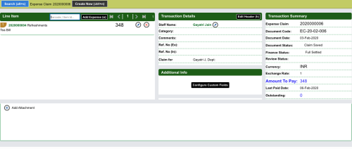When clicking on the icon of Expense Claim, the search screen is seen. In which the Claim Id, Claim Date, Claim By, Status, Item Name, Claim Amount, Outstanding and other claim details is been seen. While Clicking on the Claim id, the particular Claim can be seen.