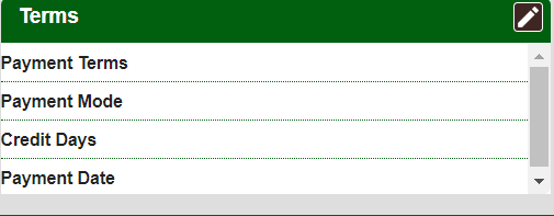 • Payment date, Credit Days, Payment Terms and Mode of Payment