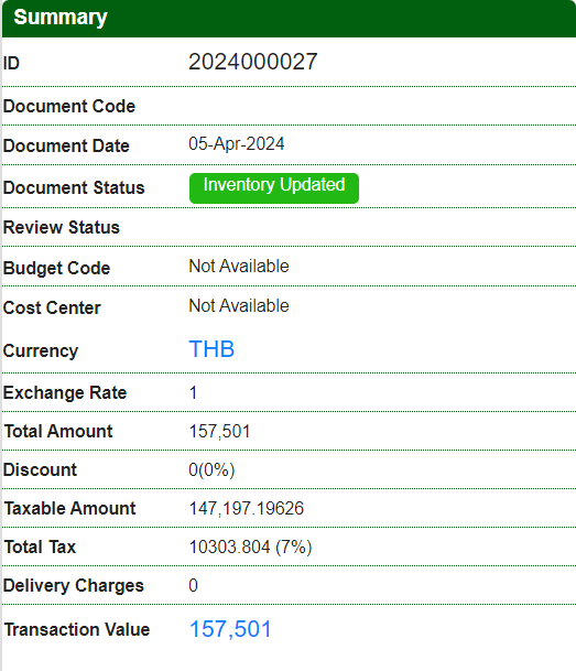 • Transaction References: Document ID, Document Code, Document Date, Currency, Budget Used, any other Reference Document that this transaction refers to