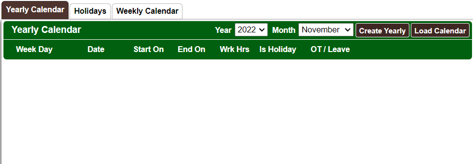 The Calendar shows the working days, holidays, leaves and overtime for a branch.