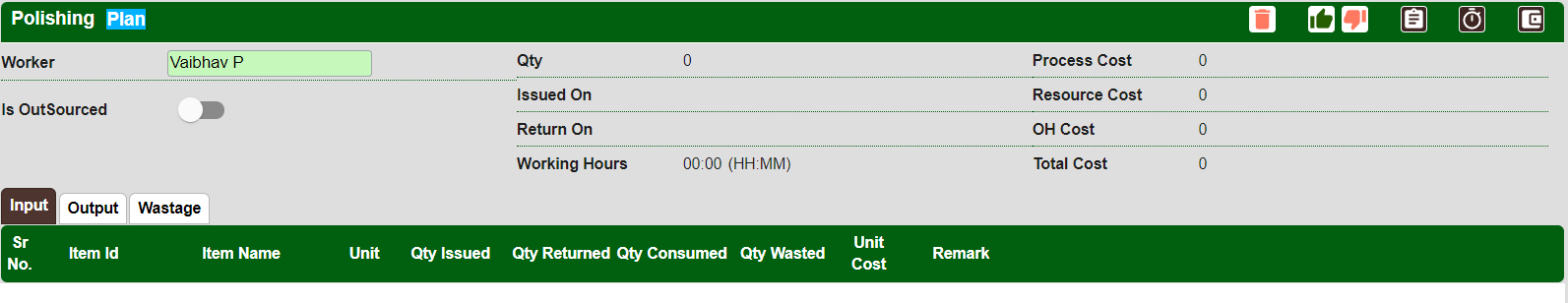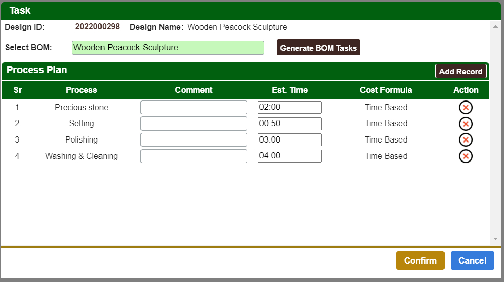 To add task without BOM, click on the Add Record action button. A new entry is created in the Process Plan section.