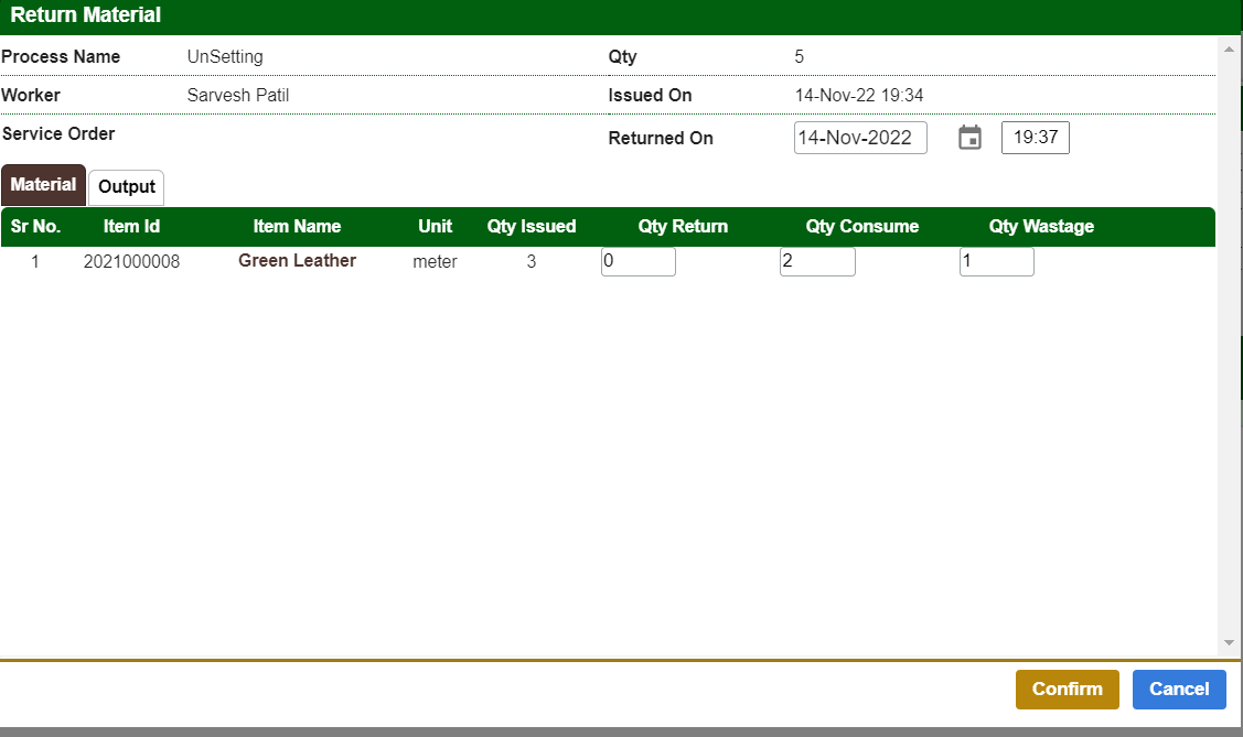 Material: To return materials, use the Material tab. The material tab shows the list of materials used in the process. Add the quantity of materials to Return, Consume or Wastage as required.