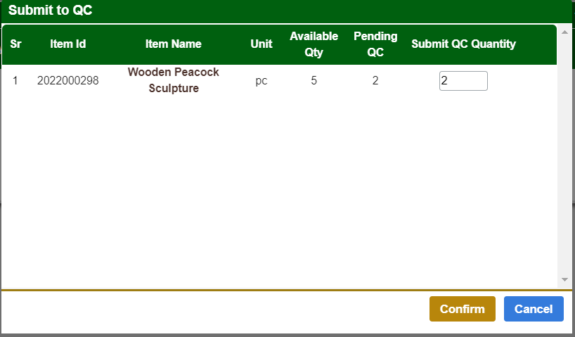 You can add the required quantity for QC in the Submit QC Quantity field. This quantity cannot be greater than the Pending Qc quantity.