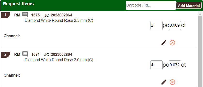 • In the material section the list of materials added for that Job Order are shown. In the Req Qty field, add the quantity of each item to be requested.