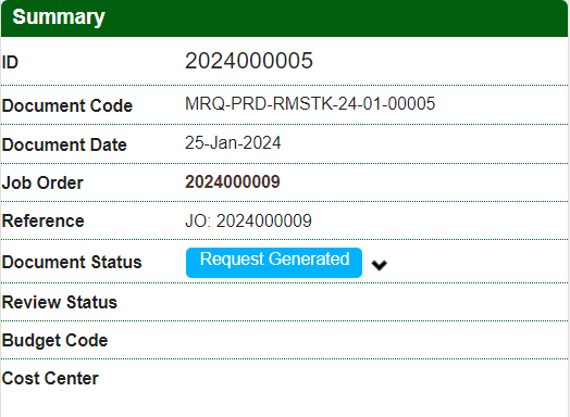 • Click on Job Order Menu and open the Job Order for which stock is to be requested.